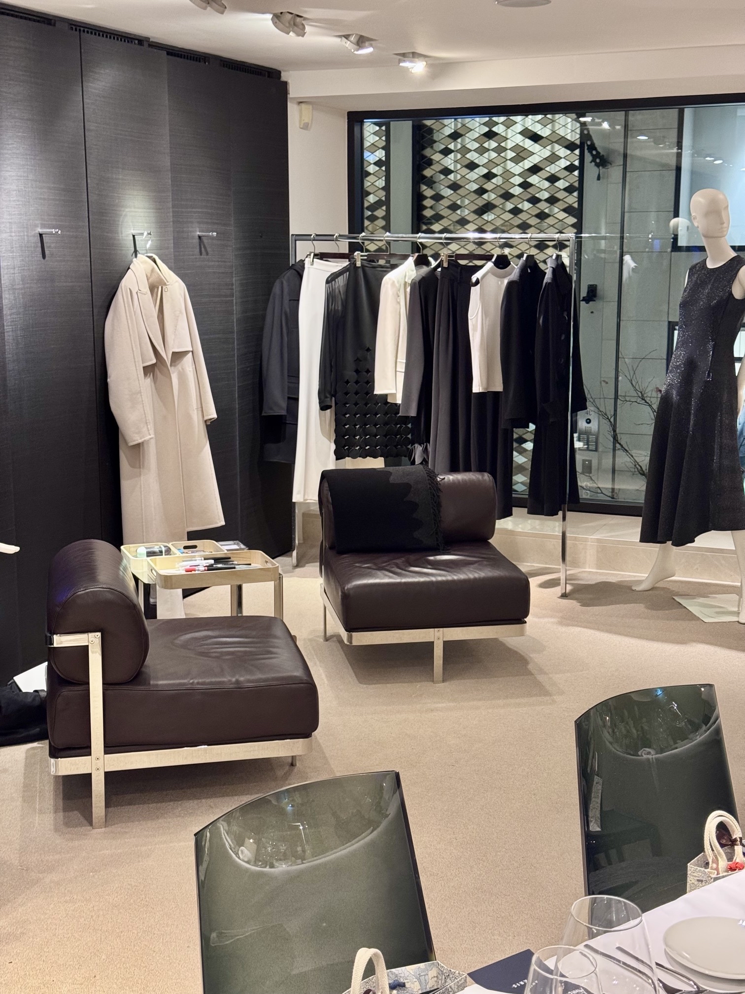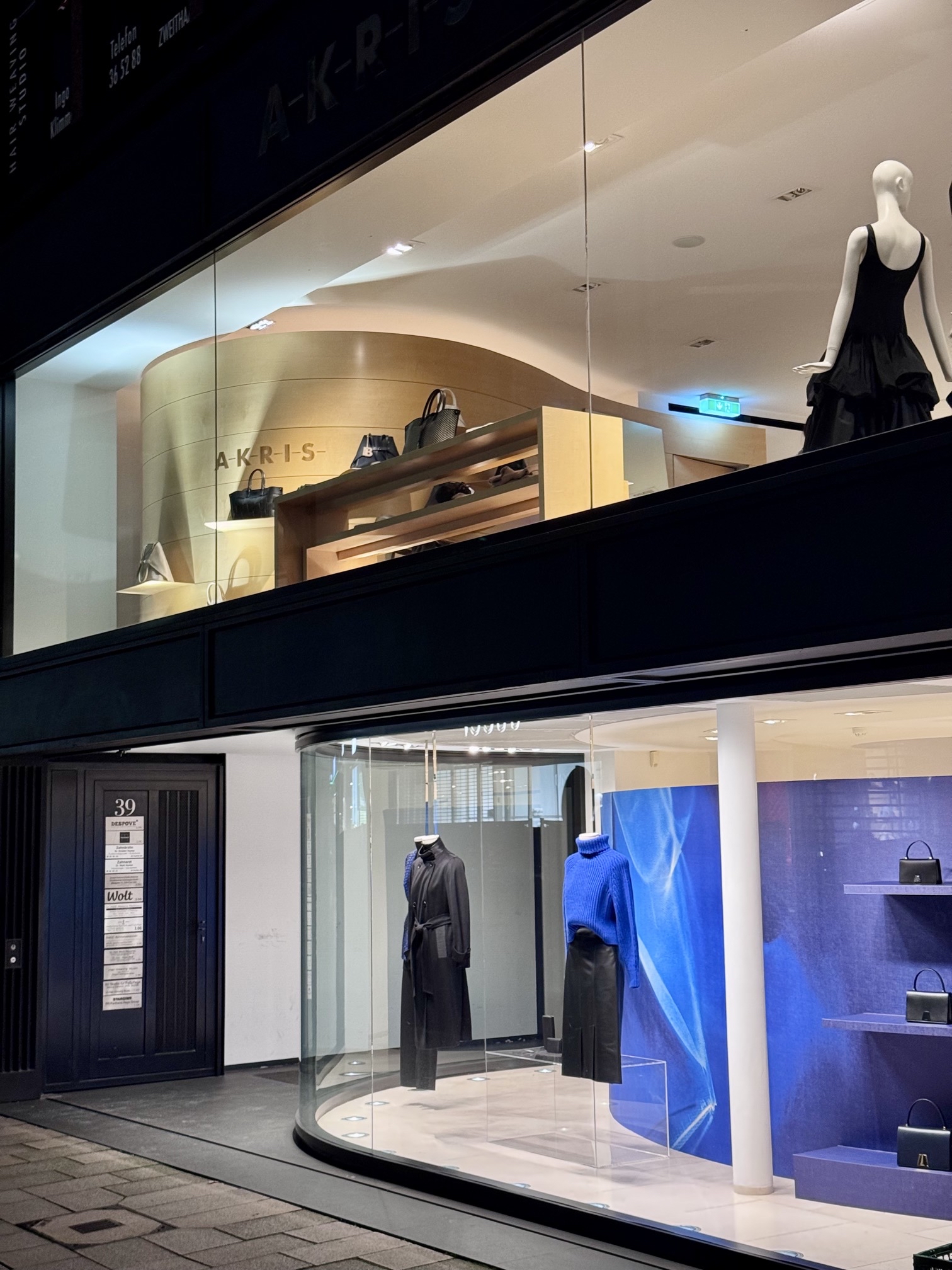 Für mich war dieser Abend bei AKRIS auch architektonisch ein Highlight. Die beiden Etagen der Boutique sind über eine elegante Wendeltreppe verbunden, sämtliche Materialien und Oberflächen zeugen von einer außergewöhnlichen Sorgfalt im Detail. Ganz im Einklang mit der Mode von AKRIS, die meisterhaft schlichte Schnitte in erlesensten Materialien umsetzt (die Kaschmirmäntel!). Mein Architektenherz schlägt hier sofort höher: Der zurückhaltende Luxus erinnert stark an Interiors der Mid-Century-Moderne. Kaum zu glauben, dass die Neugestaltung erst wenige Jahre zurückliegt.